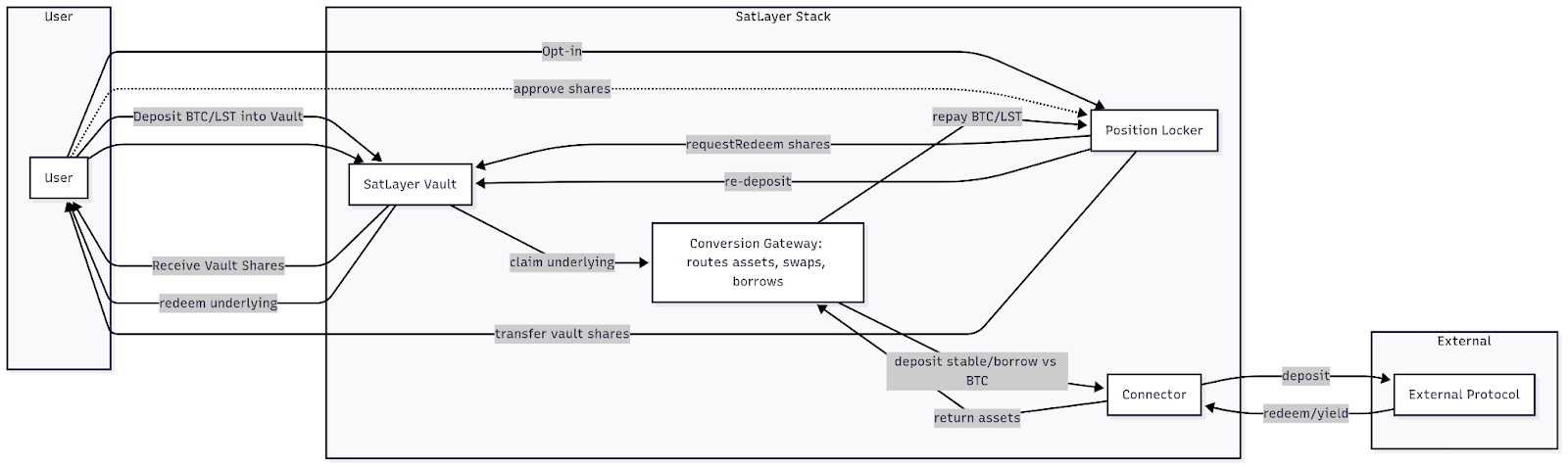 - User: User will deposit into SatLayer Vault, then opt-in to the Redemption strategy, which moves vault shares into Position Locker (PL).