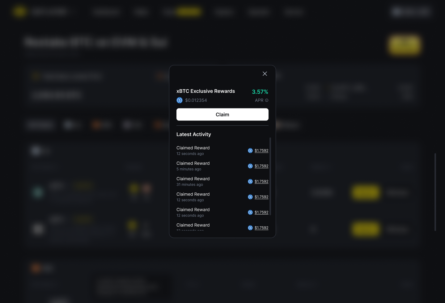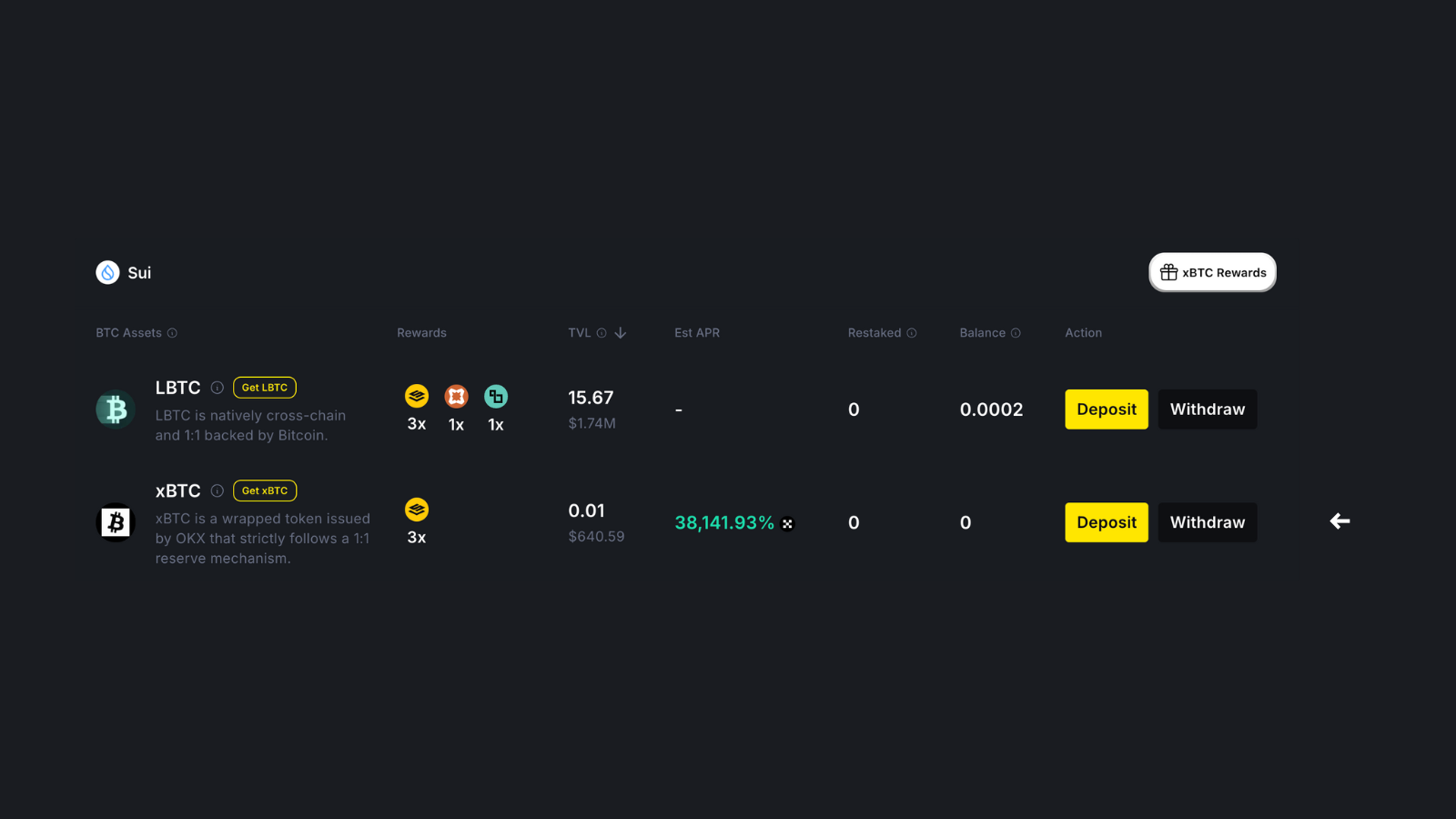 Note: You only earn APR while holding restaked XBTC. Using it in LPs or elsewhere makes it ineligible.