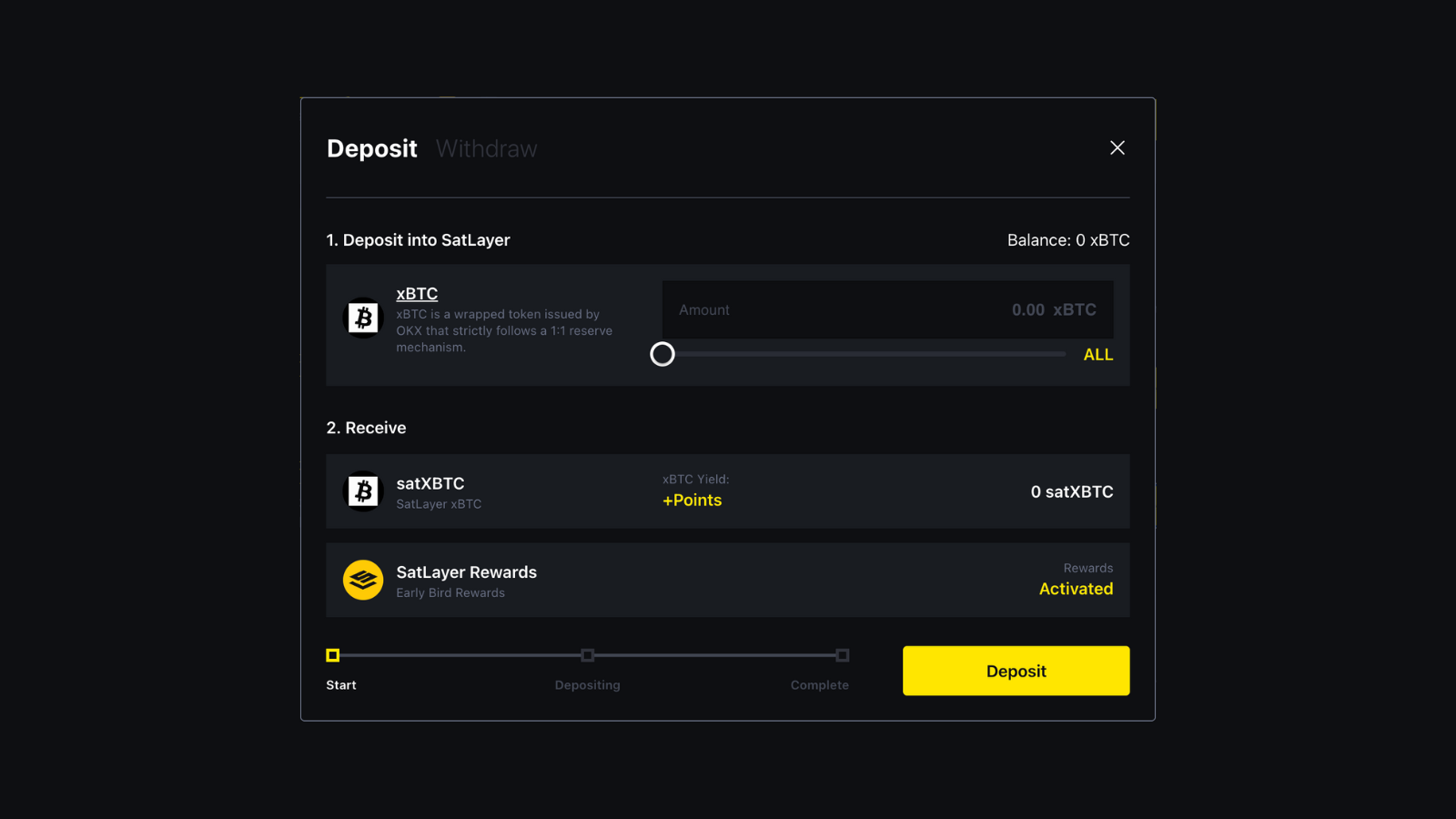 - Upon successful deposit, you will receive satXBTC as a receipt token.