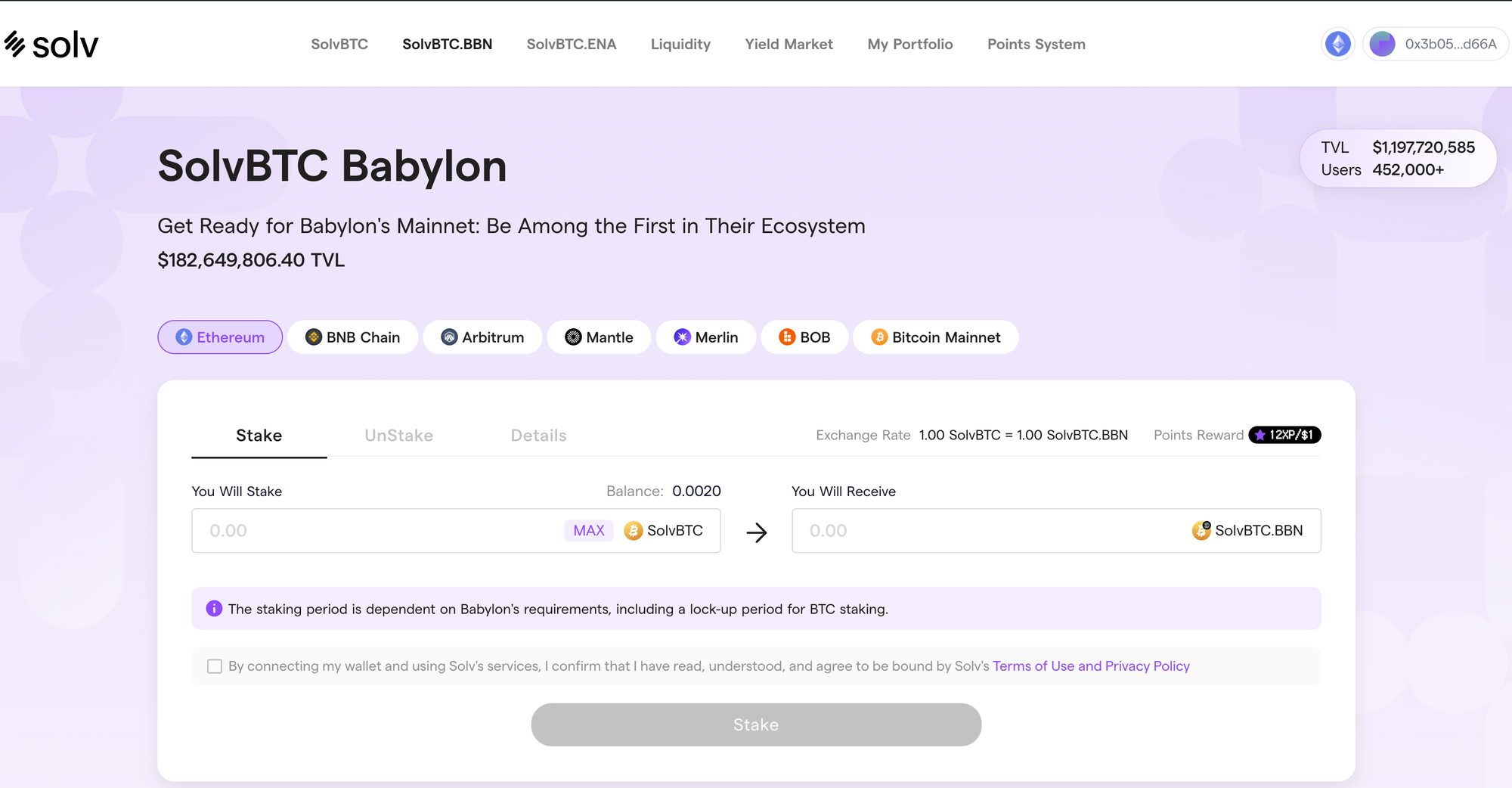 1. Head on over to the SolvBTC.BBN staking app, where you will be able to stake your SolvBTC and in return, receive SolvBTC.BBN which can then be restaked via SatLayer.