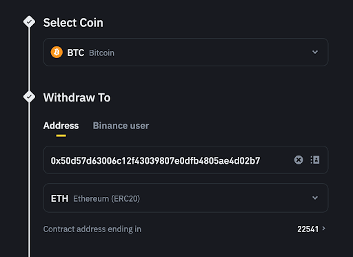 - Withdraw BTC from your CEX. If you have selected the Ethereum network, withdraw your BTC to your self-custodial wallet of choice.