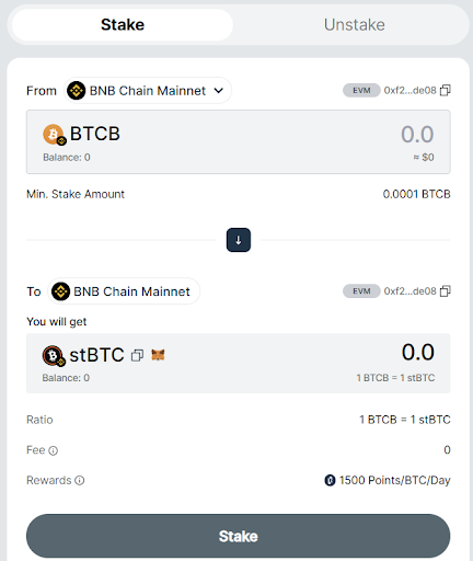 - Select either the Ethereum or BNB Chain network, depending on your asset. Enter the amount of WBTC or BTCB you wish to stake. Once finalized, click the Stake button to continue.