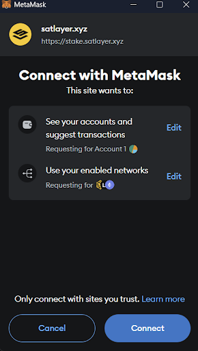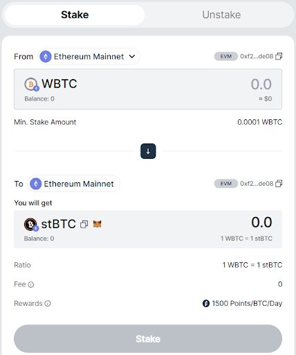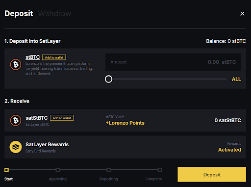 - Once you have received stBTC in your self custodial wallet, you can proceed to deposit your stBTC on SatLayer.