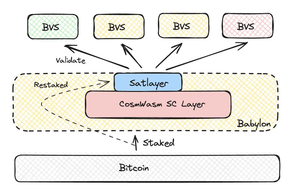 SatLayer brings restaking capabilities to Bitcoin and extends Babylon’s functionality. Bitcoin staked in Babylon can be restaked on SatLayer to provide Bitcoin-backed crypto-economic security guarantees to any protocol or decentralized application, as a Bitcoin Validated Services (BVS).